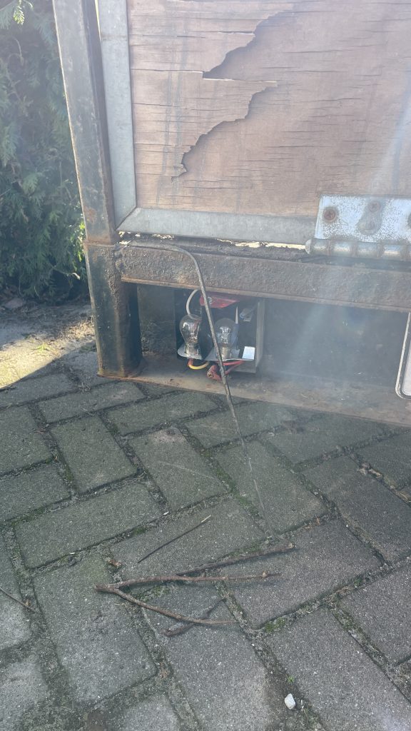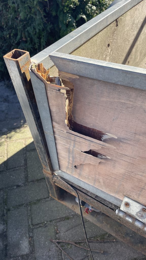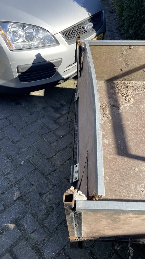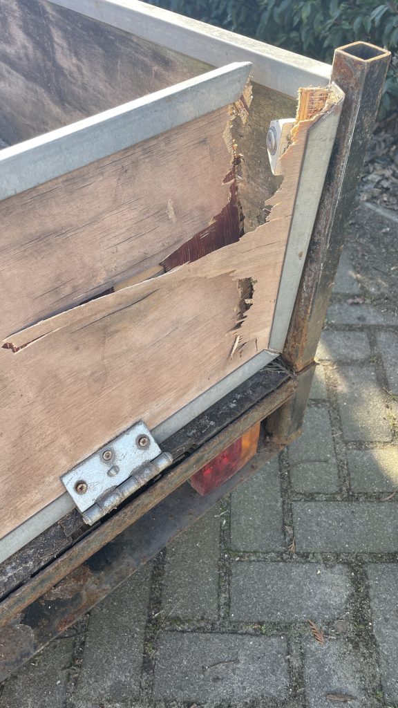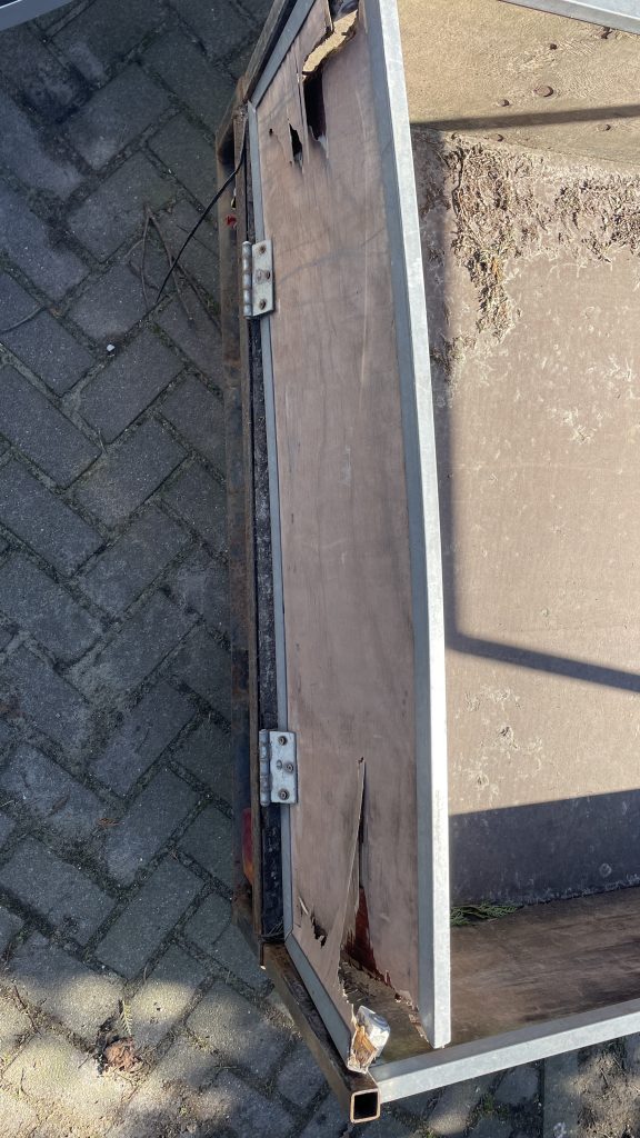 De kreukelzone van de aanhanger is in werking getreden waardoor deze nu waardeloos is geworden.